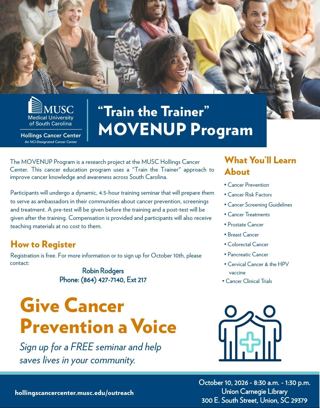 Join the MUSC Hollings Cancer Center for the MOVENUP Program, a free “Train the Trainer” seminar focused on cancer prevention, screenings, and treatment education. Participants will learn how to become ambassadors for cancer awareness in their communities.
