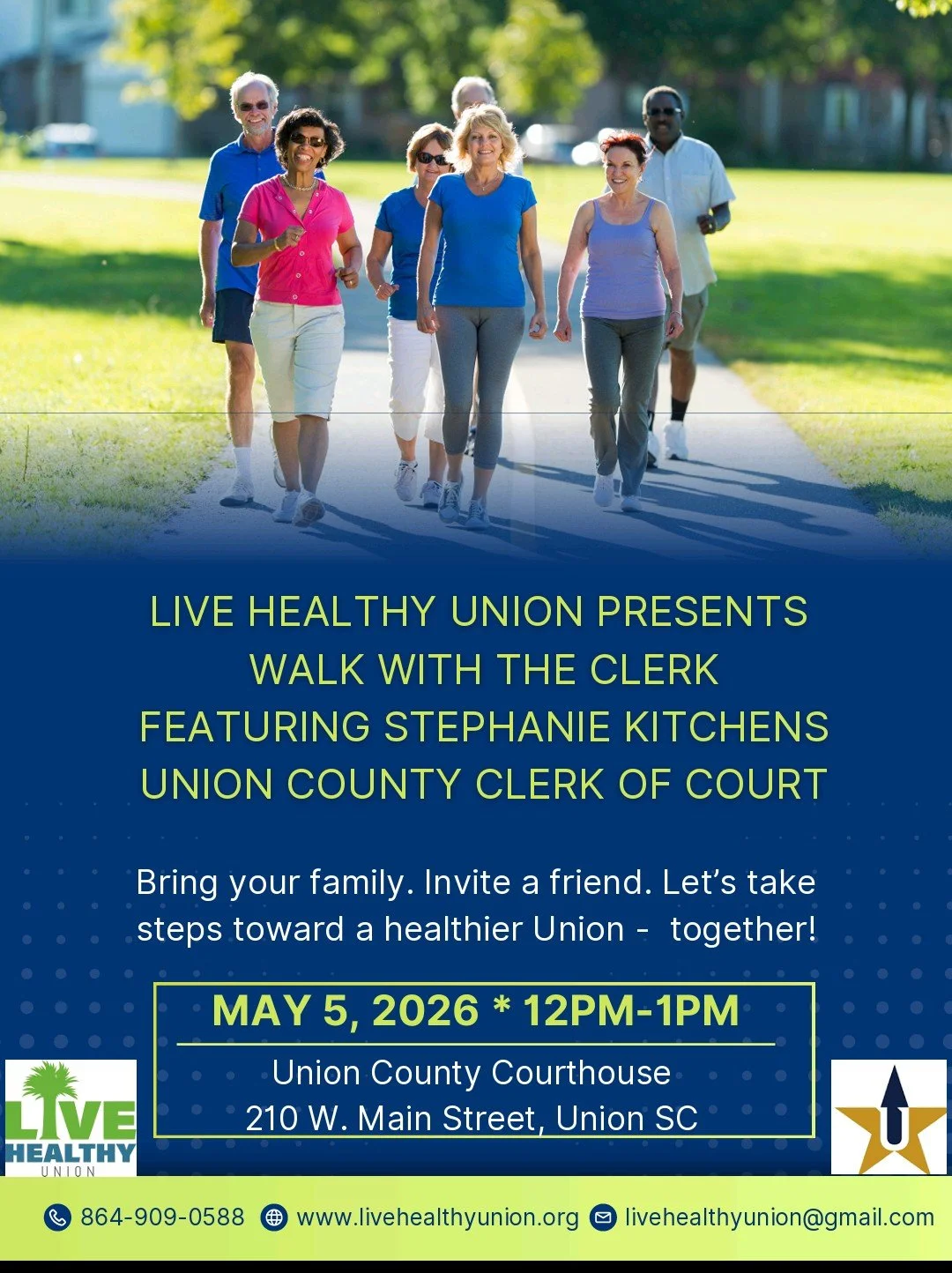 Back to All Events Walk With The Clerk Tuesday, May 5, 2026 12:00 PM 1:00 PM Union County Courthouse 210 West Main Street Union, SC, 29379 United States (map) Google Calendar ICS Join us for Walk with the Clerk featuring Stephanie Kitchens, Union County Clerk of Court! Bring your family, invite a friend, and take a step toward a healthier Union-together!